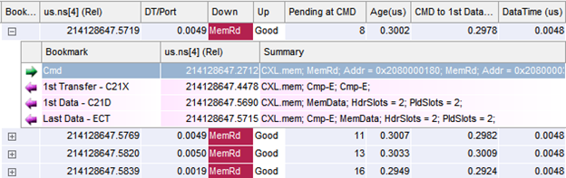 Here, we observe the details of a single CXL exchange in Xgig® TraceView. The Exchange Completion Time (ECT) represents the duration of the exchange. The Command to First Data (C21D) indicates a particularly important latency: the time to fetch the data. The Data Time (DTime) is the time from the first to last data frame, another very important measurement. Pending at Cmd (PendStart) represents the outstanding workload when the command was issued.