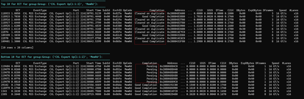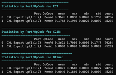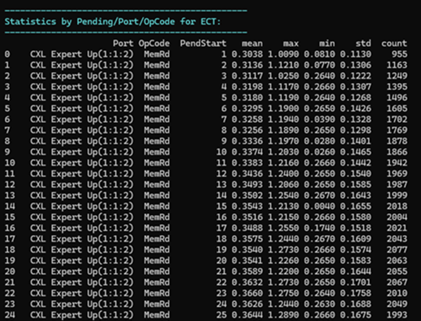 Examining the “Statistics by Pending/Port/OpCode for ECT” table reveals that this device maintains consistent performance across various workloads. The mean ECT for Memory Reads (MemRd) exhibits a gradual, steady increase from 1 to 24 pending exchanges, with only minimal variations in max/min values.