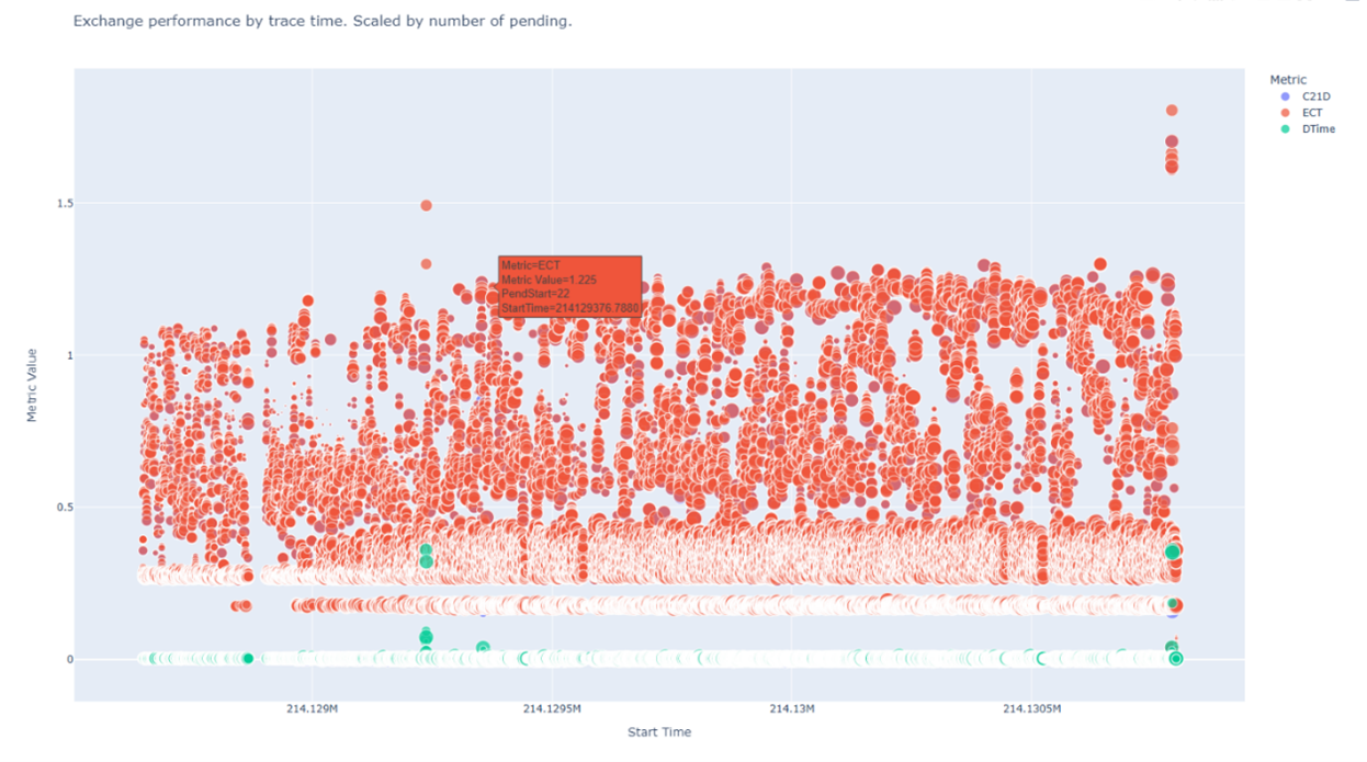 The next graph, from Xgig Serialytics, illustrates the three principal phases of a CXL transaction. In this example, the green dots (DTime) illustrate the noise floor as they should essentially be the same time for all exchanges (around 40ns for the previous example). However, visible anomalies appear, due to the retry/retransmissions occurring in the trace, highlighting the same troubles indicated in the Top Ten/Bottom Ten tables above. Visualizations and tables of data like this enhance our ability to expose the hidden behaviors of devices.