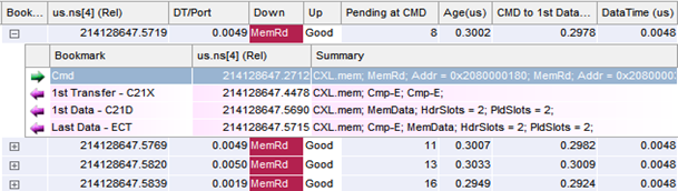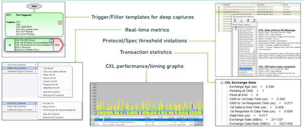 A CXL analyzer equipped with analytical software can become a time-saving tool for troubleshooting CXL links. Identifying implementation bugs early in the product life cycle is crucial for ensuring stable and high-quality products. Analyzers offer an easy view of traffic flow and provide trace analytics necessary to pinpoint problems at every layer of the protocol stack. They also feature user-friendly interfaces that aid faster debugging by flagging protocol violations and anomalous/hidden behaviors. Key features of CXL protocol analyzers include deep trace buffers, stateful triggering/filtering capabilities, detailed decodes down to the bit level, error detection capabilities, protocol compliance and comprehensive post-capture analysis. The figure below provides an example of software tool analysis, specifically from the VIAVI Xgig® software suite: