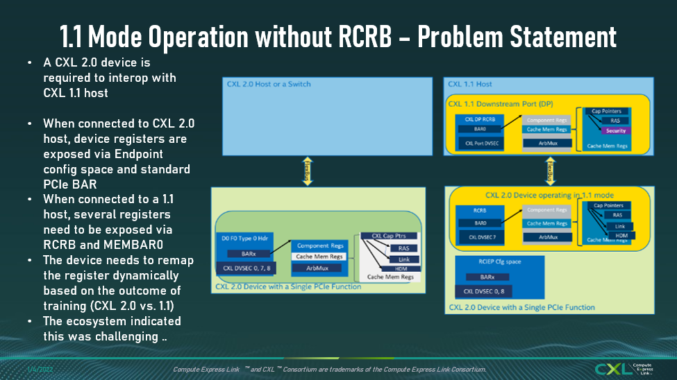 RCEC is required if the device is exposed as an RCIEP (Root Complex Integrated End Point). On slide 11, that aspect has not changed. The device on the right-hand side needs to be exposed as an RCIEP, and the link is still not visible to the legacy software because the downstream port has the same register layout as the CXL 1.1 specification. Therefore, you still need the host to implement the RCEC and the errors will always go with the RCEC. There is no difference in that behavior.