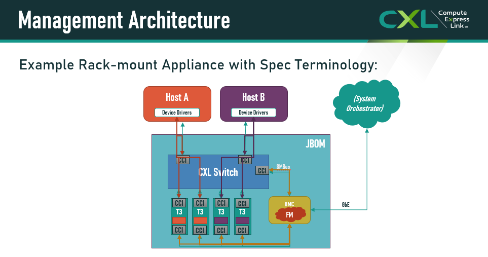 Everything above the CCI to FM interface falls outside of the scope of CXL. CXL is not specifying that GbE is used as the transport to an orchestrator. The orchestrator is not a CXL defined term; these are all just possible implementations. There are no restrictions or requirements on the FM’s capability and its interaction model with a higher level body of logic like a system orchestrator.