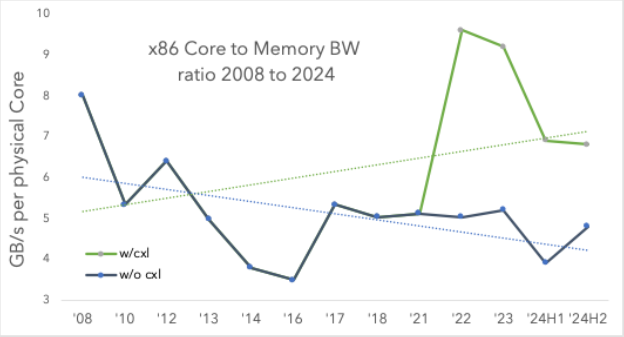 Figure 1: Physical core to memory bandwidth ratio from 2008 to 2024. CXL can add significant memory bandwidth to a server CPU if utilized appropriately. DDR Channel growth rate is slow when compared to a PCIe roadmap. Dotted lines show linear trends of memory bandwidth with and without CXL, per physical core.